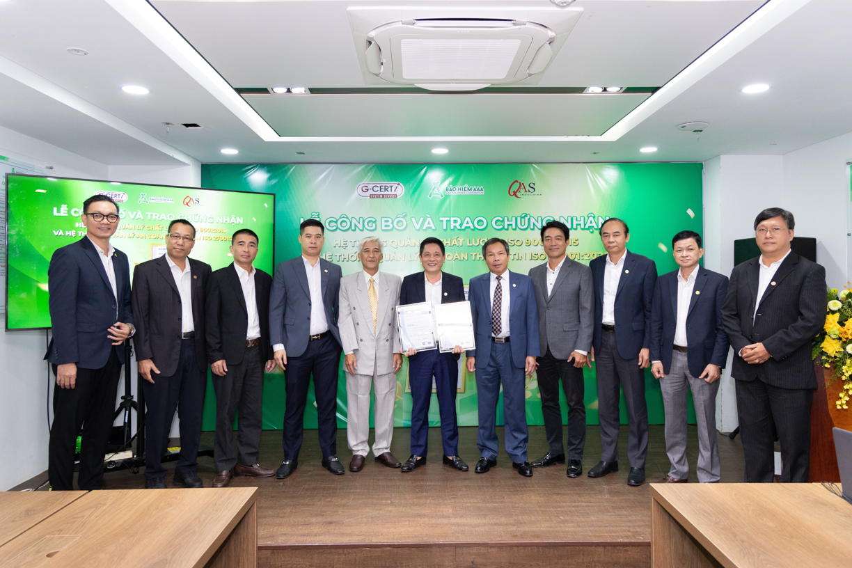 Ngày 9/10, tại trụ sở chính, Tổng Công ty cổ phần Bảo hiểm AAA được G-CERTI trao chứng nhận ISO 9001:2015 và ISO/IEC 27001:2022. Đây là hai tiêu chuẩn quốc tế quan trọng về hệ thống quản lý chất lượng (QMS) và hệ thống quản lý an toàn thông tin (ISMS).