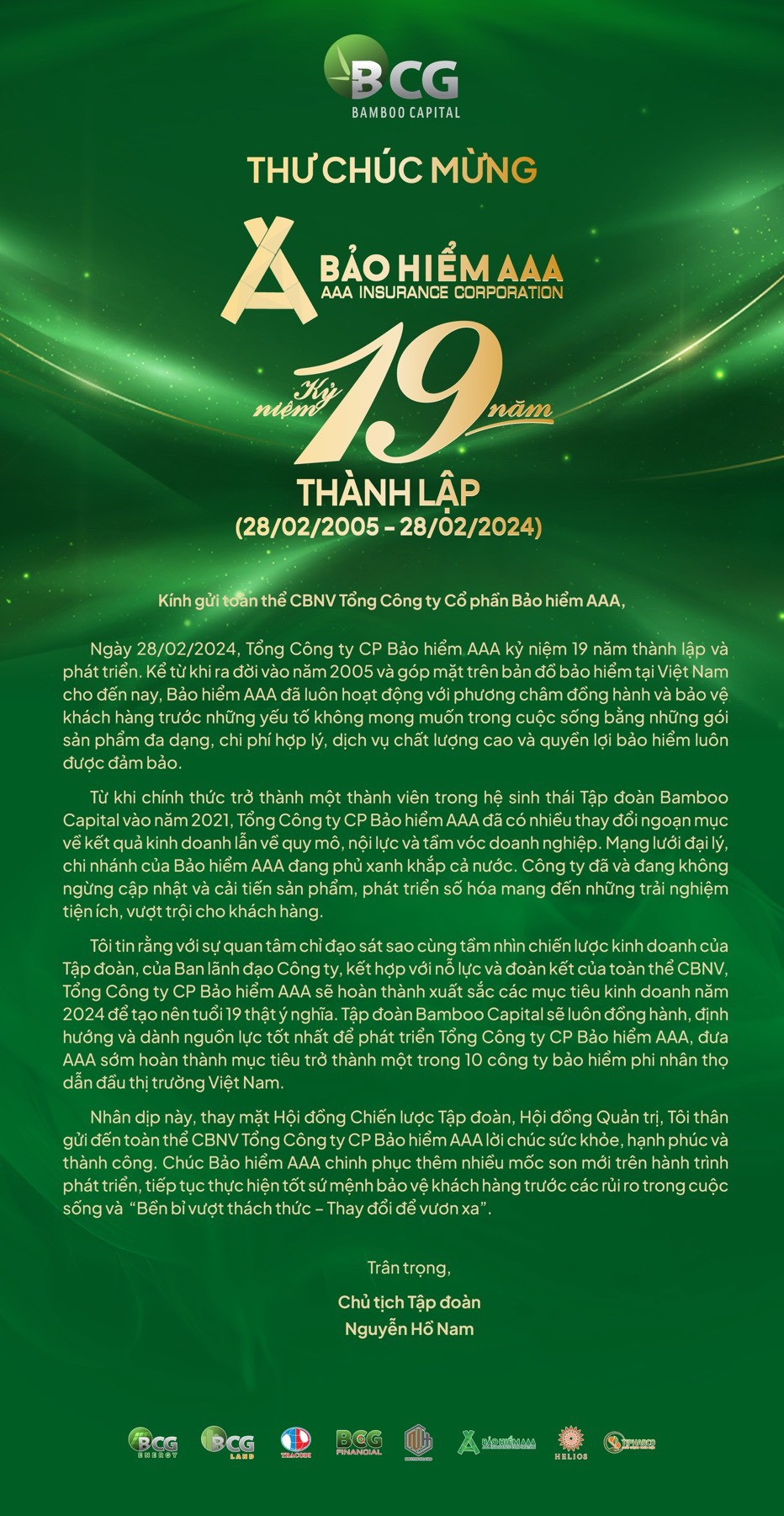 Nhân sự kiện đặc biệt này, Chủ tịch HĐQT Tập đoàn Bamboo Capital - Ông Nguyễn Hồ Nam đã gửi Thư chúc mừng đến toàn thể CBNV Tổng Công ty CP Bảo hiểm AAA. Thư có nội dung như sau: