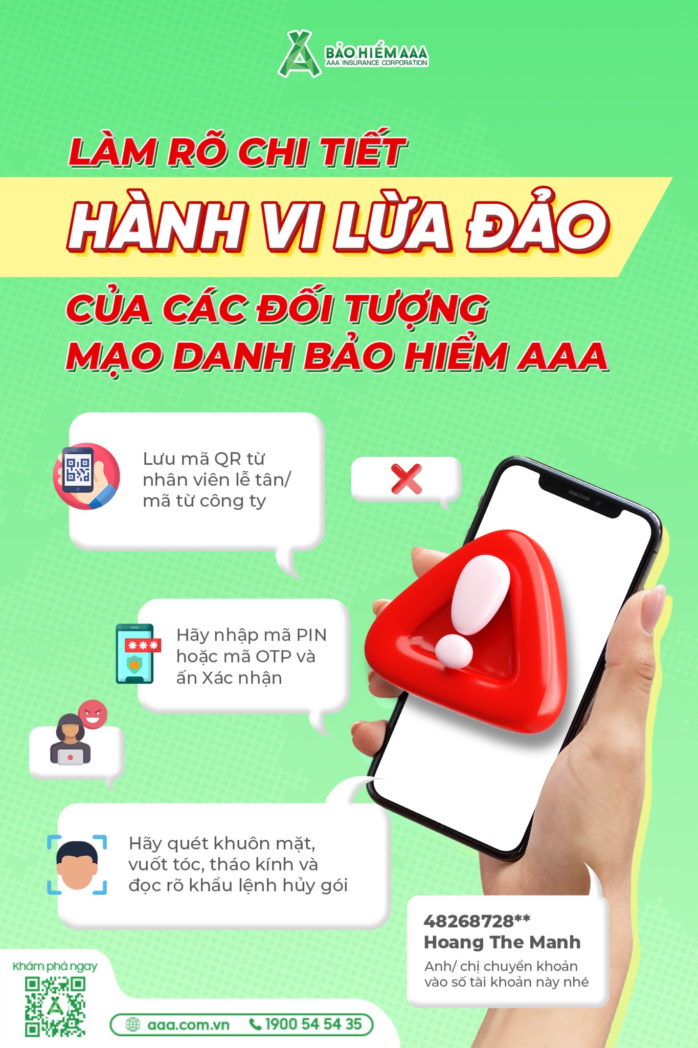 Hãy luôn kiểm tra kỹ thông tin trước khi thực hiện bất kỳ giao dịch nào, cùng Bảo hiểm AAA chủ động cảnh giác, bảo vệ bản thân, gia đình và cộng đồng trước các thủ đoạn lừa đảo!