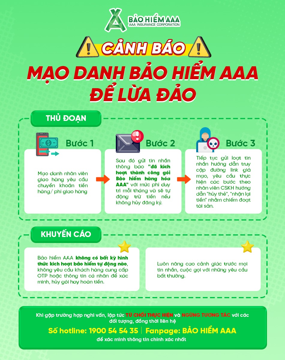Đây là hành vi lừa đảo lợi dụng hình ảnh và uy tín của Bảo hiểm AAA gây hoang mang và có thể dẫn đến mất tiền nếu khách hàng làm theo hướng dẫn.